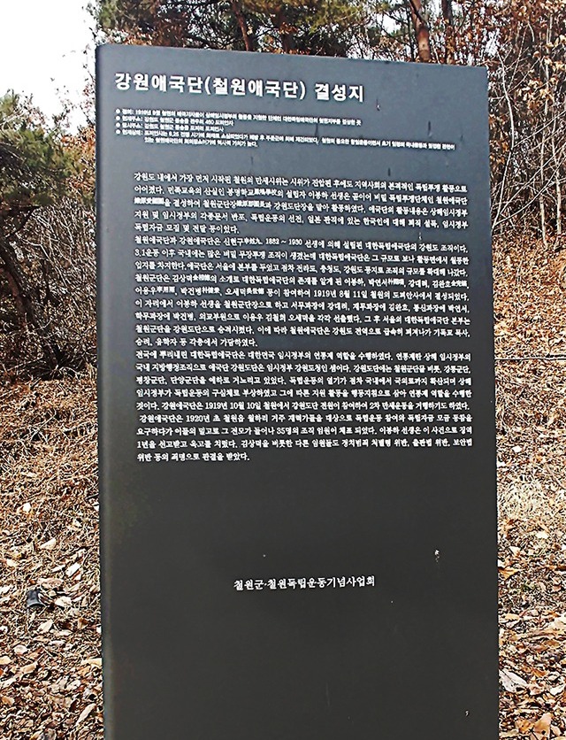 철원군과 철원독립운동기념사업회가 도피안사에 세운 철원애국단 안내판.