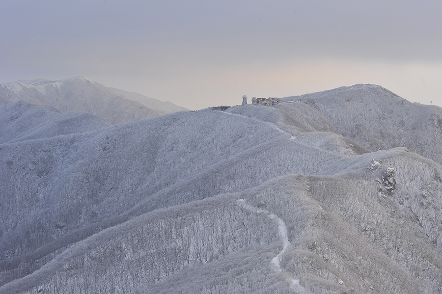 연화봉으로 향한다. 연화봉에는 1978년에 세워진 우리나라 첫 현대식 천문관측소가 있다. 대피소에서 연화봉까지는 2.7km로 능선을 따라 평탄한 길이 이어진다. 걸을 때마다 탄성이 이어진다. 하얗게 핀 상고대가 나무를 장엄하고 있고 연화봉까지 시야도 시원하게 열렸다. 아침안개에 해까지 가려져 세상이 하얀색만 가득한 모노톤으로 보인다. 상상했던 겨울산 그 이상이다. <화엄경>의 연화장세계를 표현한 연꽃봉우리를 지나면 <화엄경>의 주불인 비로자나부처님이 계시는 비로봉을 향한다. 연꽃 가득한 길을 지나 비로자나부처님을 친견하러 가는 불국토의 길을 걷고 있다는 상상을 해본다.