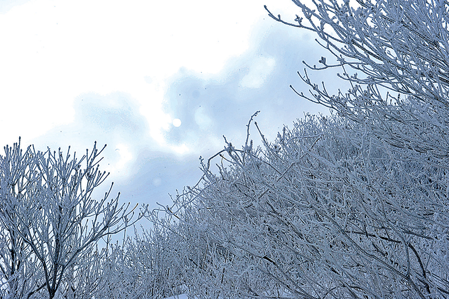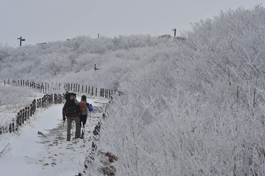 겨울산행은 설렘과 긴장감이 동반된다. 흰 눈으로 장엄된 산과 숲을 감상하는 즐거움도 있지만 추위와 눈길을 걸을 때 더 많이 소모되는 체력도 걱정해야 한다. 배낭에 먹을거리와 여분의 방한복을 넣었다. 소백산 제2연화봉 대피소에서 1박을 하기로 하고 죽령탐방지원센터에서 산행을 시작했다. 산 아래 쪽에선 보이지 않던 눈이 1시간 정도 오르니 보이기 시작했다. 땀이 나기 시작하면서 몸이 풀린다. 맑은 공기를 흠뻑 마시니 기분이 좋아진다. 제2연화봉 대피소까지 오르는 길은 4.3km로 콘크리트 포장길이다. 2시간 남짓 걸으니 제2연화봉에 있는 강우레이더관측소와 대피소에 닿았다.