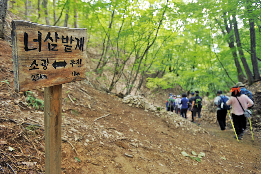 탐방객들이 보부상들이 넘던 십이령 중 하나인 너삼밭재를 넘고 있다.