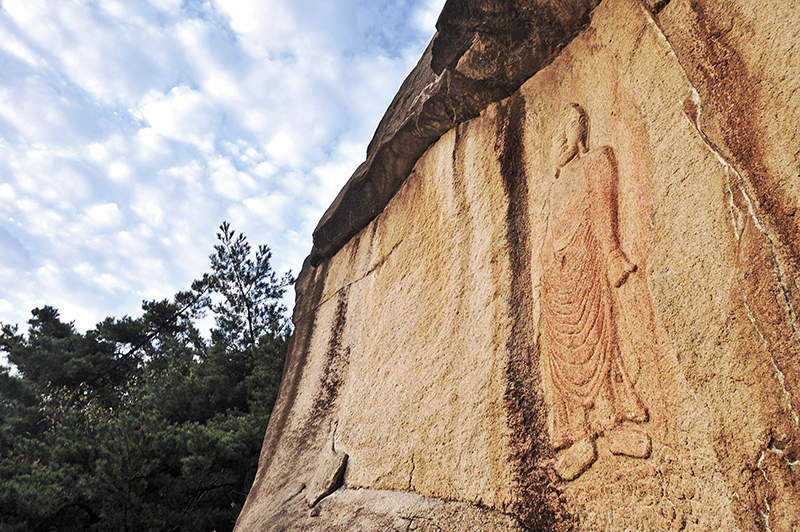 아쉬운 일출을 뒤로하고 천불전 옆으로 난 대나무 숲길을 지나 계단을 오른다. 천불전 바로 뒤쪽으로 거대한 암반이 솟아올라 있다. 용암사에서 가장 높은 곳에 위치한 그 곳에서 보는 일출이 가장 유명하다. 운해가 넓게 펼쳐진 일출을 맞이하고 있는 신비로운 바위에서 통일신라시대 사람들은 부처님을 발견했다. 그 바위 속 부처님을 조심스레 돌을 깨어 찾아냈다.
