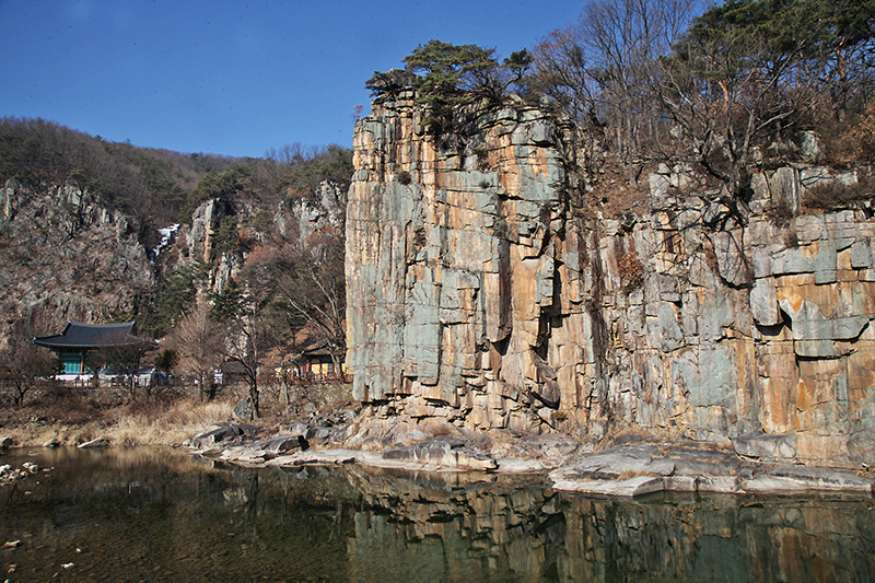 여기서 차량으로 20분 거리에 사인암이 있다. 도담삼봉 같은 기암절벽이지만, 이곳 바위는 마치 서로 다른 색깔의 비단으로 무늬를 짠 듯 독특한 색깔과 모양을 가지고 있다. 또한 해금강을 떠올리게 하는 풍경으로도 유명하다. 추사 김정희가 하늘에서 내려온 한 폭의 그림 같다고 예찬했을 정도로 뛰어난 경치를 자랑한다. ‘사인암’ 이라는 이름은 고려 후기 유학자인 역동 우탁이 지냈던 ‘사인’이라는 벼슬에서 유래한다. 그는 유난히 이곳을 좋아해 자주 찾았다고 한다.