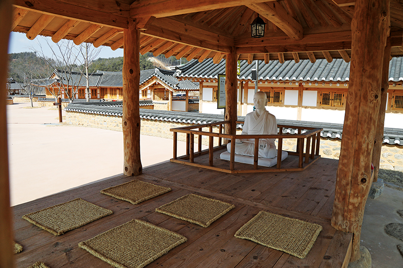 주차장에 도착해서 본 초전지 모습에서 민속촌 느낌이 물씬 풍겼다. 그도 그럴 것이 처음 마주한 곳이 전통가옥체험관. 초전지의 상당부분을 차지하는 이곳은 성불관, 자비관, 견성관, 오도관, 득도관, 대각관으로 한옥과 초가로 구성되어 있으며 신라시대 사람들의 생활양식을 불교와 연계해서 보여준다.