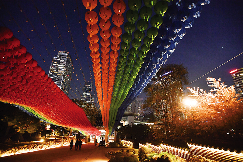 봉은사의 매력이라면 도심에서 산사의 정취를 느낄 수 있다는 점 아닐까. 지하철역에서 5분 거리, 무역센터와 복합쇼핑몰, 백화점, 도심공항터미널이 밀집된 영동대로 복판에서 천년고찰은 왠지 이질적이다. 그럼에도 고층빌딩으로 둘러싸인 강남에서 산사는 오아시스나 다름없다. 낮에는 신행 활동하는 불자들로 가득한 가운데 테이크아웃 잔을 손에 들고 봉은사 뒷산을 산책하는 직장인을 볼 수 있다. 밤에는 낮과 다른 또 다른 분위기가 연출된다. 한낮의 북적임은 사라지고 고요함이 찾아온다. 은은한 조명 속 봄꽃이 어우러진 풍치(風致)에 마음이 절로 평안해진다. 뒷산에 올라 미륵대불과 함께 화려한 도심의 야경을 내려다보고 있으면 유명 관광지도 부럽지 않다.