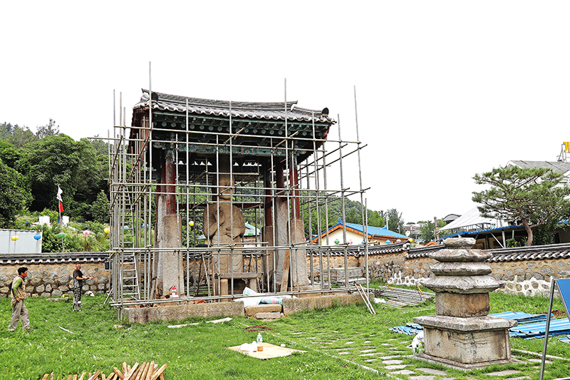 먹구름이 드리운 아침이었다. 안성으로 향하는 길에 빗줄기도 오락가락 했다. 도착한 곳은 매산리 석불입상(경기도 유형문화재 제37호). 미륵당이라 부르는 높은 누각 안에 높이 5.6m의 거대한 미륵불이 모셔져 있다. 머리 위는 고려 초기에 유행한 사각의 보개를 쓰고 있어 조성 시기를 짐작케 한다. 오른손 모양은 중생의 모든 두려움을 없앤다는 시무외인을 하고 있다. 주변은 정갈하게 낮은 담장을 둘렀고 안에는 웃자라긴 했지만 잔디가 곱게 깔려있다. 누군가의 손길이 닿고 있음이 분명하다.