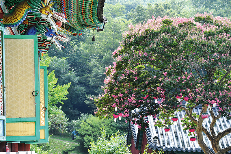 천우화을 통과해 가파른 계단을 오르면 대웅전 바로 오른편에 거대한 선홍색 꽃망울을 맘껏 터트리고 있는 배롱나무가 눈에 들어온다. 위쪽에는 선홍색 배롱나무 꽃이 피어 있고 나무 아래쪽에는 붉은 연등이 매달려 있다. 사실 배롱나무는 우리나라에 조경수로 많이 심어져 있다. 고찰이나 서원 같은 곳에 운치 있게 서 있는 모습을 본 적이 많다. 하지만 이 곳처럼 ‘나 주인공이야’ 하며 뽐내며 서 있는 모습을 본 기억은 없다. 바쁘게 대웅전에 인사를 올리고 나와 나무를 감상하니 빛이 나는 매끄러운 줄기 또한 아름답다.