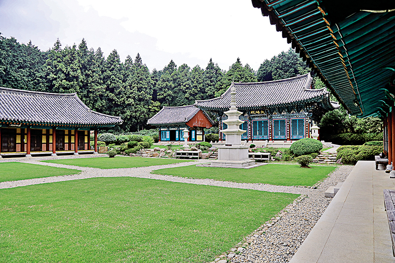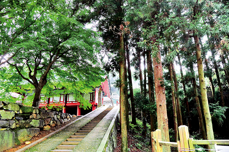 먼저 향한 곳은 용화사. 사찰로 들어서는 첫 모습이 이채롭다. 오른쪽은 곧게 뻗은 촘촘한 편백나무들, 왼쪽은 엄청난 거목은 아니지만 가지를 넓게 늘어선 포근한 아름드리나무. 그 가운데 차량 진입이 가능하게 만든 오르막 포장길인데 중심부에는 낮은 계단을 만들어 참배객들의 편의도 고려했다. 그 너머로 사찰 중심영역이 살짝 보인다. 한 폭의 그림이다.