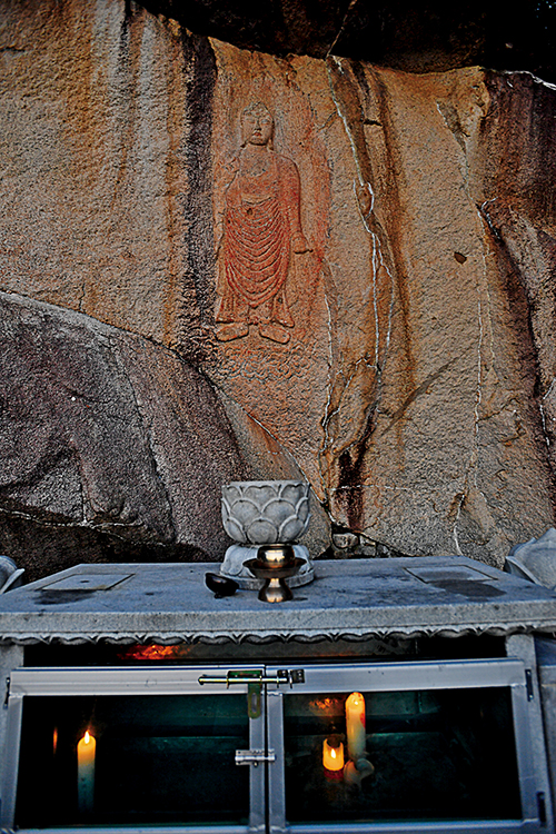 마애부처님은 통일신라 말에 조성된 것으로 높이는 3m에 달한다. 마애불 아래 누군가 올린 초가 환하게 타오르고 있다. 마애부처님을 올려다보고 있는데 여기저기서 감탄사가 터져 나온다. 구름바다 위로 붉은 덩어리가 모습을 드러내기 시작했다.