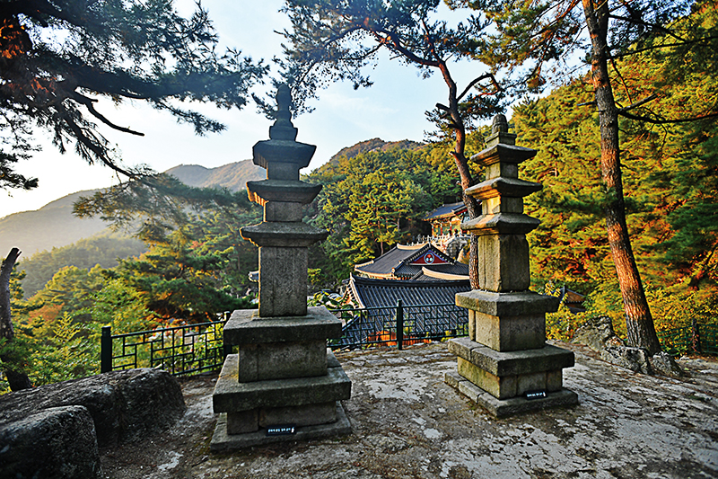 ‘찰칵, 찰칵’ 붉은 해는 경쾌한 셔터 소리에 맞춰 조금씩 솟아오른다. 웅장한 교황곡이 울려 퍼지듯 붉은 기운이 세상을 물들인다. 차가운 바위에 새겨진 마애부처님도 따뜻한 온기를 머금고 자비로운 미소를 보낸다. 자연이 선사하는 화려했던 아침 공연이 끝나자 용암사가 눈에 들어 온다. 용암사는 신라 때 창건이후의 자세한 역사는 전해지지 않지만 사세(寺勢)가 컸는데 임진왜란 때 폐허가 되었다고 한다. 법등을 근근이 이어오다 근래에 복원되었다. 용암사에는 빼놓을 수 없는 성보가 또 하나 있다. 대웅전 좌측 언덕을 이루는 바위 위에 서 있는 쌍삼층석탑으로 보물 제1338호로 지정되어 있다. 쌍삼층석탑은 고려시대 성행했던 산천이 쇠퇴한 기운을 복돋아 준다는 산천비보사상(山川裨補思想)을 바탕으로 세워졌다고 한다. 산천비보사상으로 건립된 석탑들은 대부분 단탑이고 높이가 2~3m로 작은데 비해 용암사 삼층석탑은 유일한 쌍탑이고 동탑은 높이가 4.3m, 서탑은 4.1m로 거대하다. 쌍탑이 세워진 곳은 용암사를 가장 아름답게 볼 수 있는 장소이기도 하다.