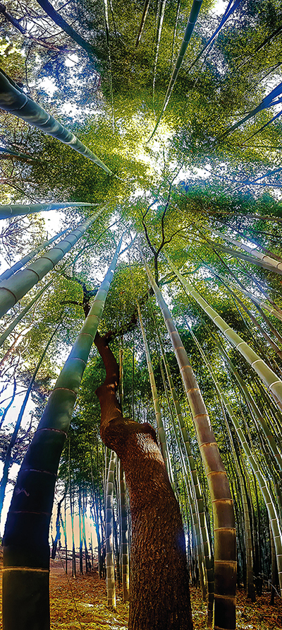 아쉬움을 뒤로하고 촬영을 위해 대나무 숲 경계를 둘러봤다. 소나무 숲에 둘러싸여 있다. 하지만 위협적으로 포위당한 것이 아닌 어우러져 있다는 표현이 적당할 것 같다. 간혹 소나무가 대나무 숲 사이에 들어와 함께 산다. 이 경우 주인인 대나무는 언제나 꼿꼿하지만 자리를 옮겨온 소나무는 넉살좋게 대나무를 휘돌며 함께 한다. 이 모습을 사진으로 표현하기가 쉽지 않다. 멀리 물러나서 찍으면 한 장에 담기지만 물러선 만큼 밋밋해지면서 피사체의 입체감이 사라져 버린다. 그래서 선택한 방법은 대나무의 왜곡을 감수하고 가까이에 붙어 전방을 바라보며 시작해서 하늘방향으로 카메라를 서서히 올려 연속 촬영해 여러 장을 잇는 방식이다. 멀리서 보면 영락없는 뒤로 젖히기 운동이다.