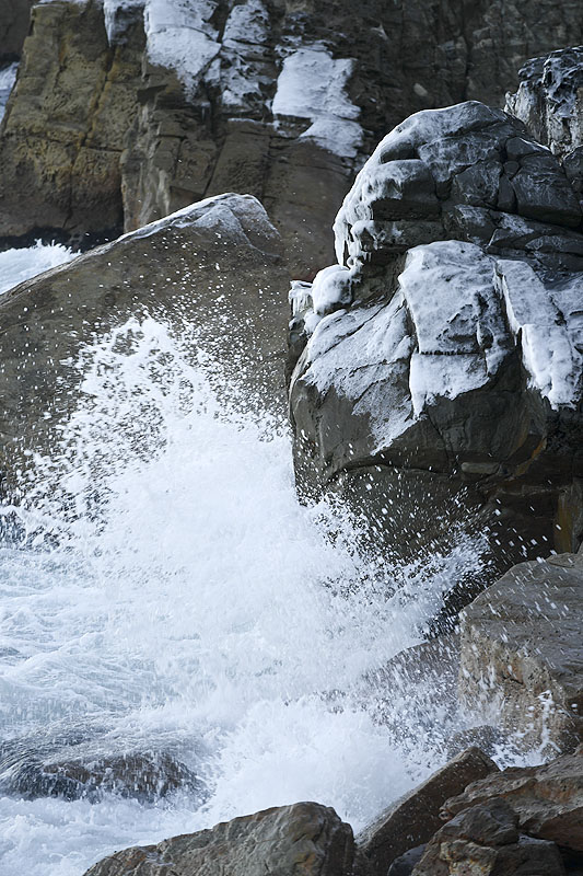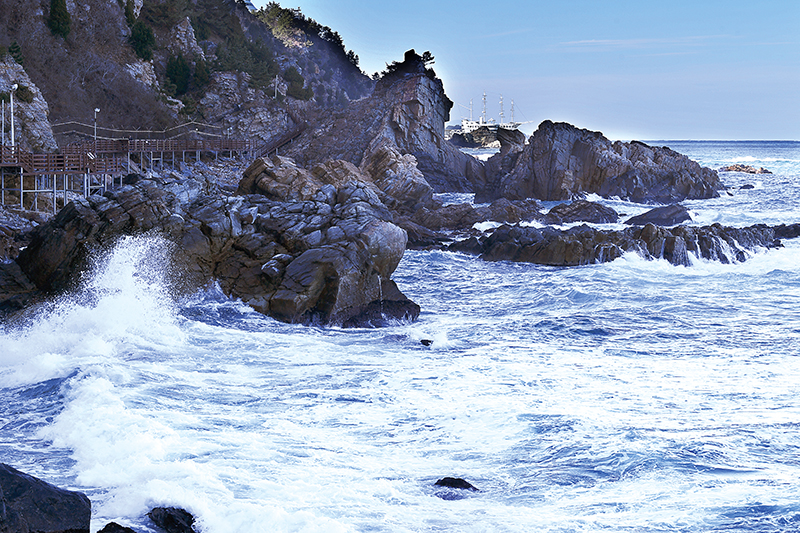 | 차가운 푸른 물이 기암괴석을 때린다. 물은 하얀 얼음 꽃잎이 되어 뭍으로 튀어 오른다. 다시 거대한 물결이 몰려온다. 부드럽게 시작하지만 다가올수록 날카로워 진다. 계속되지만 지루하지 않다. 늘 새로운 모습을 만들어 내는 겨울바다다. |