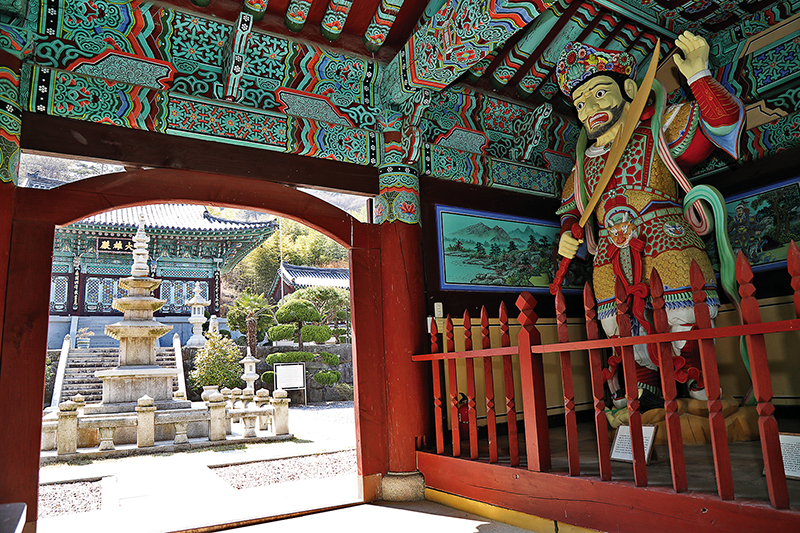 석축위 아름드리 소나무와 사천왕문이 조화롭다.