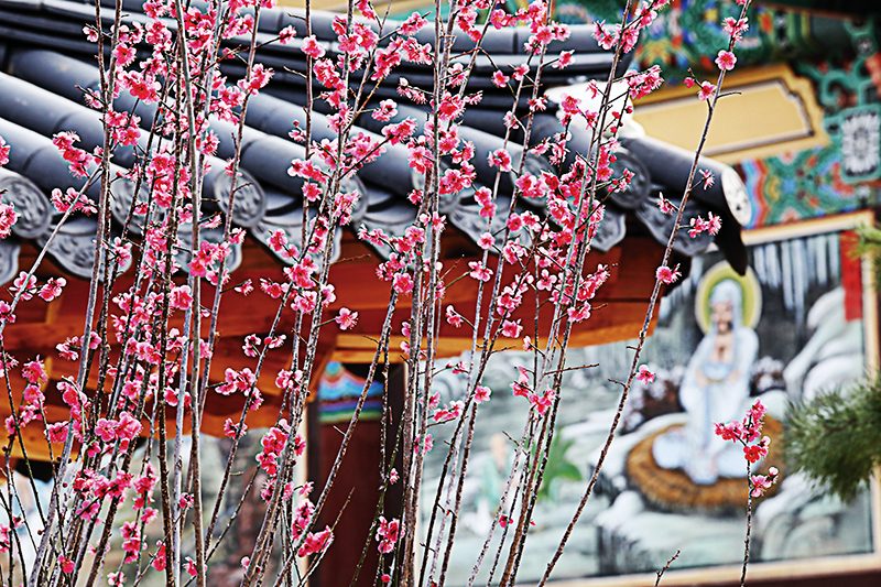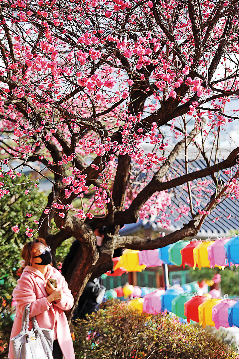 다만 때가 때인지라 누구 하나 소리 내지 않고, 서로 적당한 거리를 유지하며 고개를 들어 매화를 바라볼 뿐이다. 그 시선에는 근심을 잠시 내려놓은 편안함이 보인다. 멈춰선 이곳에 들리는 건 풍경소리뿐. 매화가지 사이로 미륵대불 상호가 보인다. 엷은 염화미소를 짓고 있다. 눈으로 전해지는 안심법문이다. 매화를 비롯한 봄꽃들이 도량을 장엄할 뿐 아니라, 찾아든 이들에게 마음의 위안도 전해주고 있었다.