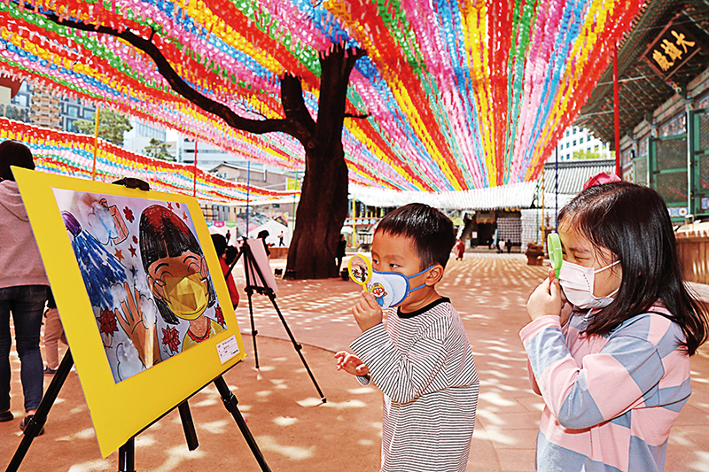 연등 물결 아래 펼쳐지는 천진불들의 작은 뽐내기 전시회다. 코로나 사태로 어린이집들은 휴원 상태이지만, 긴급 돌봄이 필요한 원아들은 등원이 가능하다. 4월14일에는 ‘코로나19 함께 이겨내요’를 주제로 그림 전시회가 열렸다. 원아들이 부모님과 함께 고사리 손으로 그리고 눌려 쓴 글씨가 작품이 되었다.
