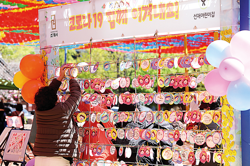 연등만들기 주제는 ‘행복한 우리 가족’과 ‘코로나19 극복 염원’ 등 두 가지였다. 이때 만들어진 연등 가운데 40여 점이 현재 조계사에 전시되어 있다. 아름드리 큰 조계사 회화나무에 걸린 듯 그 넓게 펼쳐진 형형색색 연등물결이 밑으로 가족등이 줄맞춰 매달려있다. 규모는 단출하지만, 정성만큼은 한가득이다.