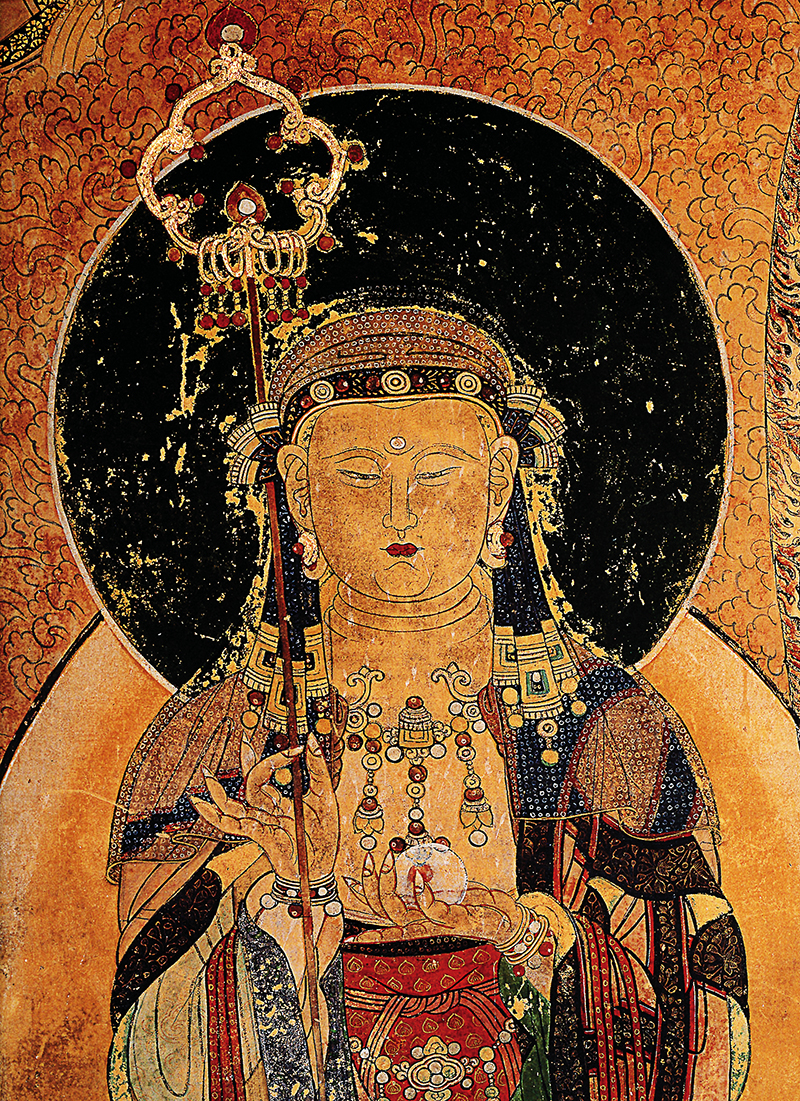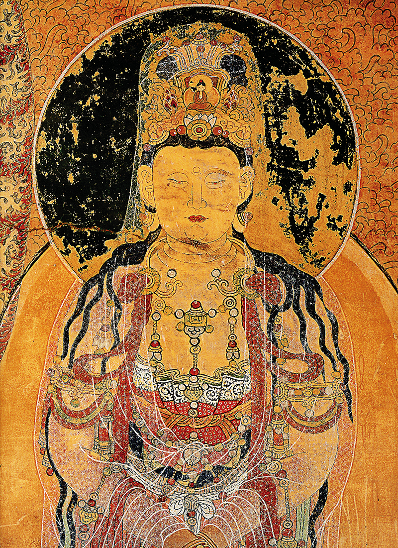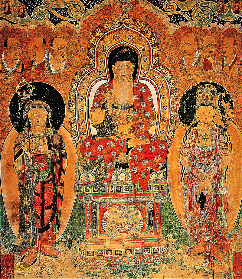 두 번째는 화면의 구성이다. 무위사 아미타삼존도는, 앞서 설명했듯이, 아미타여래, 관세음보살, 그리고 지장보살로 구성되어 있다. 본래 <관무량수경>에 따르면 아미타여래의 우협시는 대세지보살이지만, 실제 동아시아 불교 조각이나 그림 등 작품에서는 지장보살로 대체된 사례가 적지 않다.