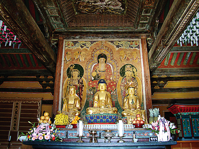 극락보전의 내부로 들어가면 정면 중앙에 아미타삼존좌상이 불단 위에 모셔져 있고 그 뒤로 후불벽에 아미타삼존도가 그려져 있다. 아미타삼존도는 건물이 지어지고 46년 후인 1476년에 그려진 벽화이다. 세로 270cm, 가로 210cm의 크기의 흙벽에 붉은색과 녹청색을 위주로 하고 백색, 군청색, 황토색을 일부 사용해서 채색했다.