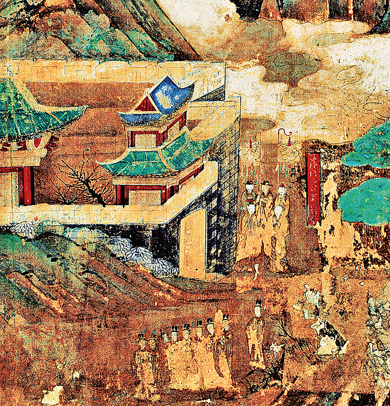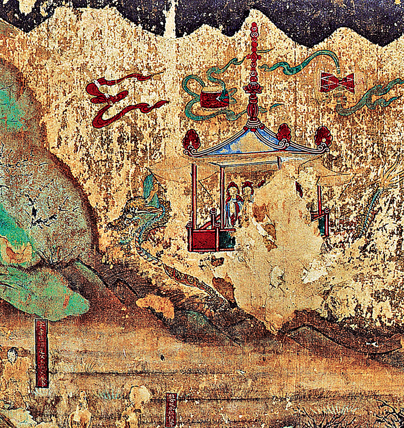 화면의 아래쪽에는 전혀 다른 방식의 그림이 한 점 있다. 언뜻 보기에는 산수화처럼 보일 정도로 산과 구름이 많은 부분을 차지하고 있는데, 조금만 더 자세히 보면 전각과 인물들도 눈에 들어온다. 이 그림은 기림사의 ‘창건설화도’이다. 그림을 둘러보기에 앞서 기림사에 전승되어 오고 있는 창건 연기를 먼저 소개하고자 한다.