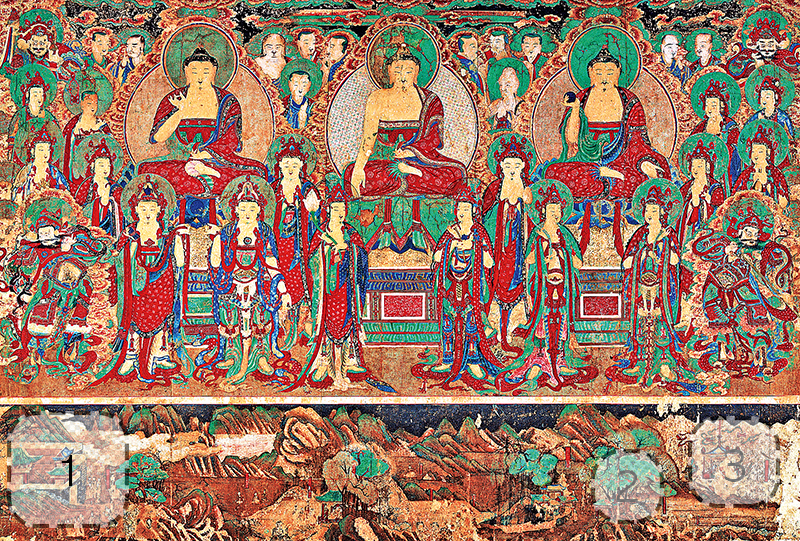 이 불화는 조선 1788년에 제작된 것으로, 화면의 크기가 세로 225.5cm, 가로 335.5cm에 이르는 비교적 큰 그림이다. 그런데 특이하게도 한 폭에 두 가지 주제가 함께 구성되어 있다. 우선 전체의 4분의3 정도를 차지하는 화면에는 세 분의 부처님이 자리하고 있다.