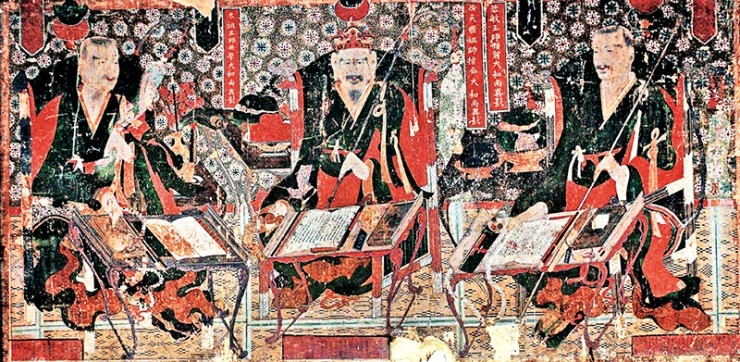 세 분 스님의 앞에는 각기 경상(經床)을 두고 그 위에 경전, 벼루 및 먹과 붓 등을 올려 두었다. 스님들 사이에는 별도의 탁자를 두고 여러 종류의 과일과 꽃, 붓, 공작 깃털 등을 놓았다. 배경이 되는 상부 벽면에는 연화문, 당초문, 점문을 빼곡히 그려 넣어 장식성을 부각했다.