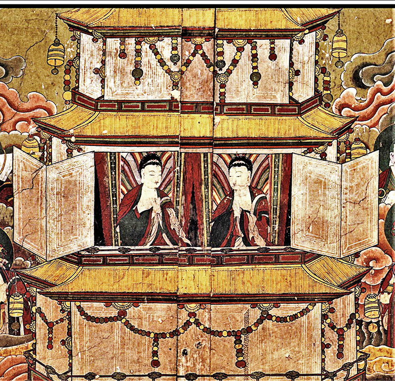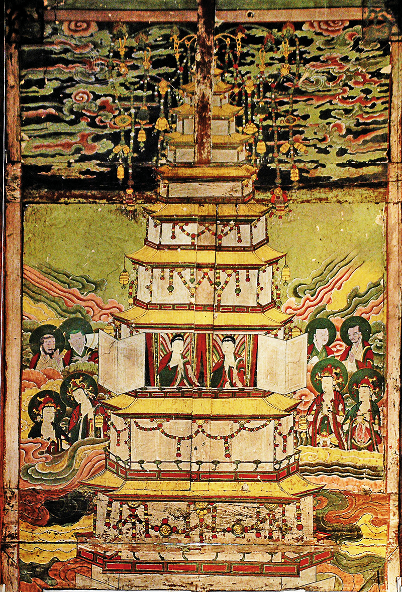 또한, 초층부터 7층까지는 난간을 표현했고 그중 3층까지는 연꽃잎 모양의 난간을 세밀하게 그려 넣었다. 보탑의 주위에는 서운 속에 상반신을 드러낸 보살과 제자들이 좌우 각 2위씩 대칭을 이루며 서 있다. 석가여래와 다보여래는 보탑의 3층에 마련된 감실(龕室)에 서로 마주 보며 합장한 자세로 자리하고 계시며 그 뒤로는 오색의 서기(瑞氣)가 뻗어 나가고 있다.