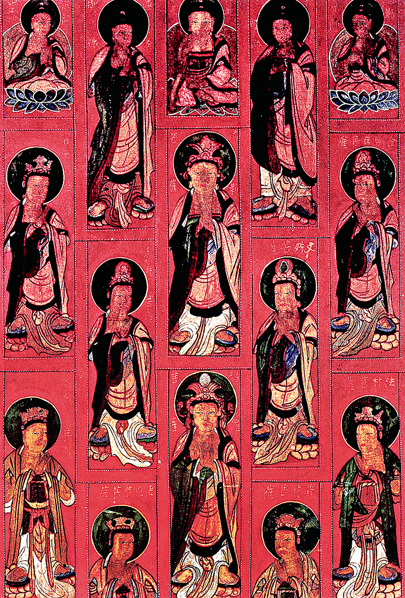 청룡사 가사도 화면의 윗부분에는 연꽃잎 위에 자리한 좌상과 입상의 부처가 그려져 있으며 그 아래로 합장을 하고 서 있는 보살이 4열로 그려져 있다. 그 아래에는 권본(卷本)과 절첩(折帖) 형식의 경전 꾸러미가 마치 민화(民畵)의 책가도(冊架圖)를 연상시키는 모습으로 표현되어 있다. 책거리 아래로는 스님들이 좌상과 입상으로 위치하며 화면의 좌우 가장자리에는 사천왕이 각 2위씩 그려져 있다.