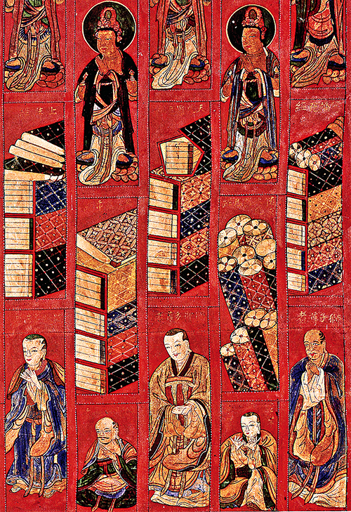 한편 중국이나 일본의 가사에도 존상이 표현된 경우가 있다. 예를 들어, 중국 송원대 제작된 자수 가사(일본 지온인 소장)에도 부처와 보살, 나한과 사천왕, 일월 등이 표현되어 있다. 하지만 해당 사례들은 실제 사용되었던 가사이며 경전이 모티프로 표현되어 있지 않다.