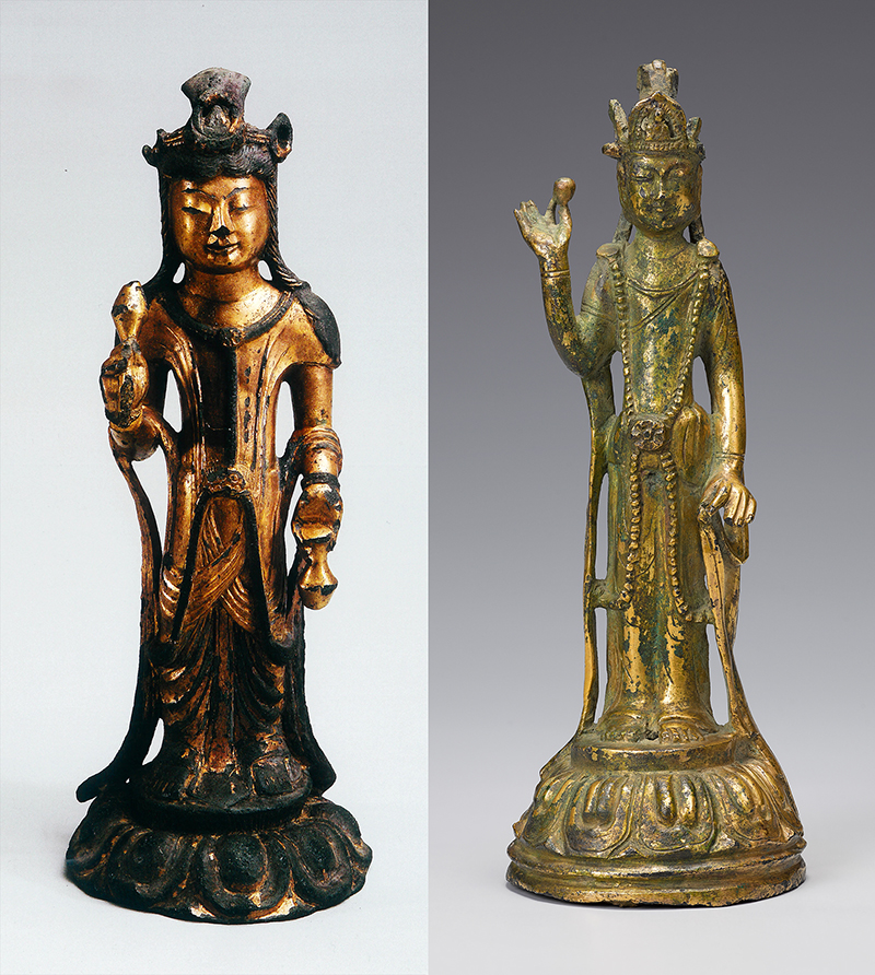한편 7세기가 되면 관음보살신앙이 유행하면서 관음보살입상이 독존 형식으로 조성된다. 이는 548년에 이미 관음보살입상이 주존으로 조성되던 양나라 등 중국 남조의 영향을 받아 이루어진 것이다. 발정(發正) 등 스님들이 남조에서 <묘법연화경> ‘관세음보살보문품(觀世音菩薩普門品)’을 공부하고 귀국하면서 관음보살의 영험이 6세기 후반부터 백제에서 유행하였고 7세기에 들어와서는 관음보살입상이 독존으로 만들어지게 되었다.