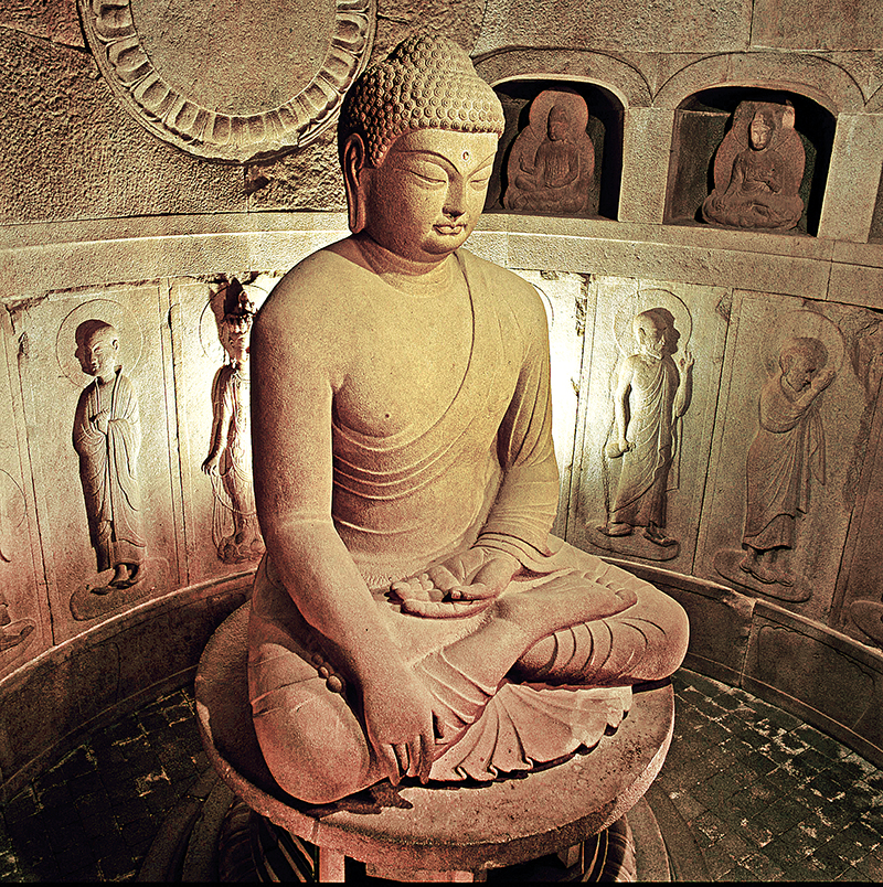 그런데 석불사가 조성되던 8세기 중엽에 찬술된 60권 <화엄경>의 주석서에서는 경전의 주인을 노사나불(盧舍那佛)이 아니라 십불(十佛)로 기록하고 있다. “10”은 십지(十地), 십주(十住), 십현문(十玄門), 십전유(十錢喩) 등 화엄 철학의 골격을 이루는 숫자이자 화엄 교학에서 만수(滿數, 완성된 숫자)로 여긴다. 성소 벽면의 승려상(비구상, 제자상)과 그 위 감실(龕室) 속의 보살상의 숫자를 의도적으로 “10”에 맞춘 것도 주존 불상 속에 십불의 성격이 들어있기 때문일 것이다.