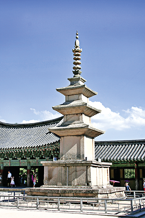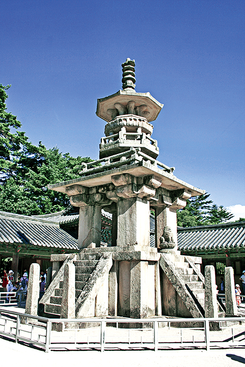 청운·백운교를 건너면 자하문(紫霞門)이 나온다. 자마금색(紫磨金色)의 부처님 광명이 서린 문이란 뜻으로 불국정토에 이르렀음을 말한다. 문을 들어서면 석가탑과 다보탑이 있다. 먼저 서쪽에는 ‘석가여래상주설법탑’인 석가탑이 인도 영취산처럼 바위가 솟아오른 곳에 우뚝서있다. 탑을 둘러싼 8송이 연꽃은 <법화경> 청문(聽聞) 보살이 앉아 부처님을 에워싸고 <법화경>을 듣는 사실성을 더해주고 있다. 석가탑을 다른 말로 ‘무영탑(無影塔, 그림자가 없는 탑)’이라 한다. 아사달과 아사녀의 애틋한 그리움에서 비롯된 설화에서 무영탑이라 하였으나 이는 설화일 뿐 교리적인 해석은 아니다. 태양 자체엔 그림자가 없는 것처럼 부처님은 태양과 같은 존재이기 때문에 그림자가 없다는 의미이다. <법화경> ‘여래수량품’에서 말한 여래의 법신은 영원불멸한 존재이기 때문이다.