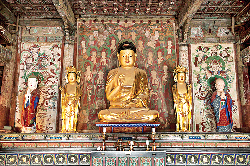 <대지도론>에서 “기사굴산은 과거, 현재, 미래의 부처님이 머무르는 곳”이라 했다. 기사굴산처럼 불국사 대웅전에도 과거·현재·미래의 삼존불이 계신다. 본존 석가모니불은 특이하게 항마촉지인이 아닌 설법인을 하셨다. 그 까닭은 불국사가 <법화경>의 ‘상주설법처’임을 나타내기 위함이다. 삼존불은 조선 영조 45년(1769)에 조성하여 모셨는데 바라보아 좌측에는 제화갈라보살을, 중앙에는 석가모니불을, 우측에는 미륵보살을 배치해 불국사는 삼세의 부처님이 머무는 영원불멸한 공간임을 표현했다. 그 옆에는 젊은 아난과 늙은 가섭존자가 있어 영산회상을 느끼게 한다.