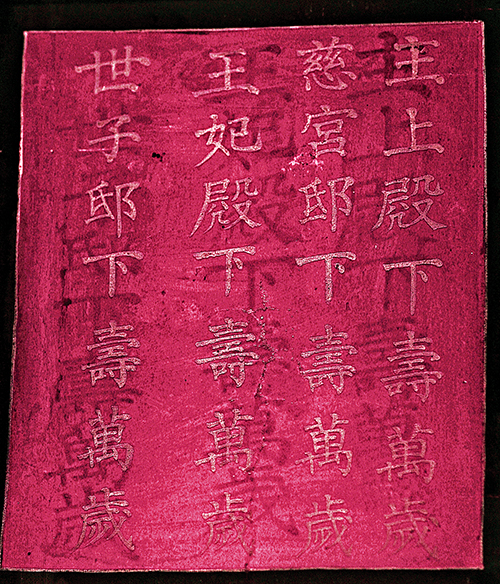 용주사 삼세불화에는 누가 그렸다는 화기(畵記)가 없는데, 만약 화기를 적었다면 그것은 살아계신 부처님이 아니고 누군가 그려 점안했다는 인상을 지울 수 없기 때문일 것이다. 그래서 부처님의 대좌 밑에 왕실의 안녕을 기원하는 축원문(祝願文)만 살짝 넣어두어 살아계신 부처님께서 항상 보살펴 주십사하는 바람을 나타냈다. 처음 쓴 축원문은 먹으로 “주상전하수만세, 왕비전하수만세, 세자저하수만세”를 써 넣었는데, 이 축원문을 본 정조는 어머니에 대한 축원이 없는 것을 알고 불호령을 내렸을 것이고, 그 바람에 축원문 위를 붉은 물감으로 덧칠하고 다시 은으로 “주상전하수만세, 자궁저하수만세, 왕비전하수만세, 세자저하수만세”로 고쳐 썼다. 사진으로 보이는 검은 글씨가 처음 쓴 축원문이고 흰 글씨가 다시 고쳐 쓴 축원문이다. 정조는 어머니 혜경궁 홍씨를 왕비 효의왕후(孝懿王后)보다 임금 다음에 두어 파격적인 효심을 부처님께 아뢰었었다.