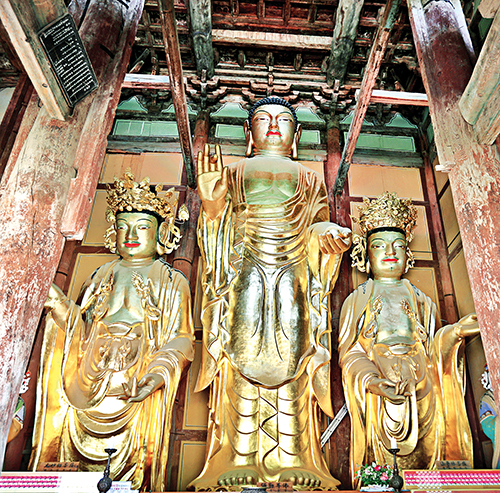 또한 1635년에 지은 보물 827호 대장전에는 1644년에 조성한 석가모니, 가섭, 아난 삼존불을 모셨다. 둥근 얼굴, 가늘게 뜬 눈, 입가의 미소 등 친근감이 간다. 특히 타오르는 불꽃 속에 넝쿨로 이어진 연꽃이 두광과 신광에 섬세하게 조각되어 화려하다. 영가스님의 ‘증도가’에 ‘화중생련종불괴(火中生蓮終不壞)’라는 말이 있다. ‘삼계가 불타는 집이어도 부처님의 말씀은 불꽃 속에 핀 연꽃과 같아 무너지지 않는다’는 것을 광배에 표현했다. 금산사는 예나 지금이나 중생들의 아픔을 미륵신앙으로 감싸주는 귀의처로 미래의 희망을 약속한 사찰이다.