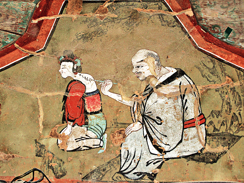 미륵전 포벽에는 스님이 기생의 등에 시를 쓰는 특이한 그림이 있다. 당나라 벼슬아치 퇴지 한유가 불교를 얕잡아 보고 기생 홍련을 보내 태전선사를 파계시키려 했으나 실패했다. 홍련의 목숨이 위태롭게 되자 태전선사가 그의 등에 시를 써주어 한유의 어리석음을 꾸짖었다. “十年不下鷲融峯(십년동안 축융봉을 내려가지 않고서)/ 觀色觀空色卽空(색과 공을 관하니 색이 곧 공이라)/ 如何曹溪一適水(어찌 조계의 한 방울 물이 흘러서)/ 肯墮紅蓮一葉中(한 잎 홍련에 떨어짐이 옳겠는가)”