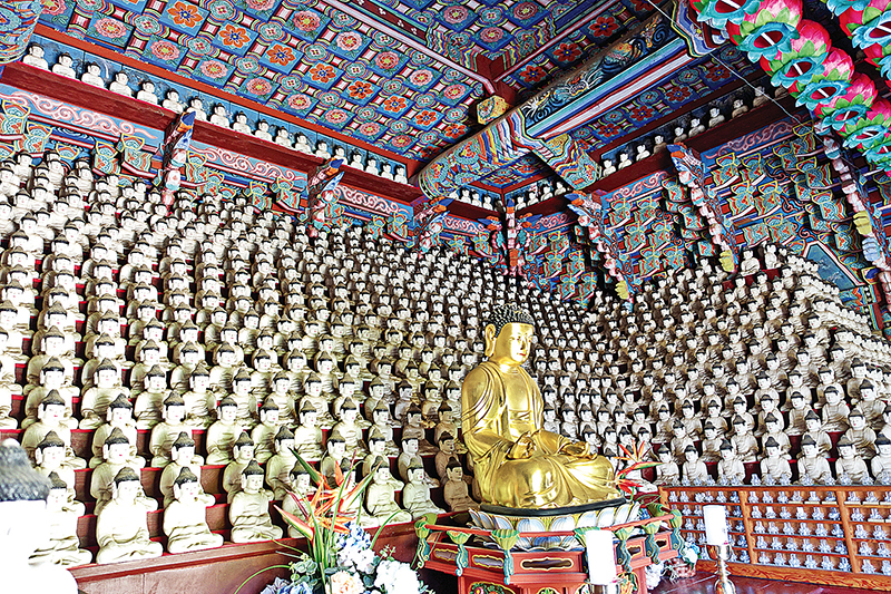 아담한 천불보전(千佛寶殿)은 네 사람만 들어가도 꽉 찬 느낌이지만, 연꽃으로 장엄된 화엄궁전은 우주를 채워도 남을 듯 아름답다. 천 분의 부처님이 존재한다는 것은 누구라도 부처가 될 수 있다는 뜻이지만, 아무나 부처가 될 수는 없다. 구층암 모과나무 기둥처럼 참고 견디는 인욕바라밀을 실천해야만 부처가 될 수 있기 때문이다.