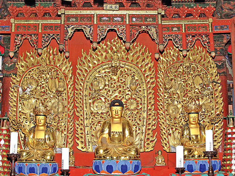남양주 흥국사 대웅보전 삼존불. 삼존불 뒷면에 화려하게 투각된 금빛 보주형 목조 광배가 눈길을 끈다. 자세히 보면 광배에는 엄숙한 모습의 일곱 분의 화불과 장난 끼 섞인 모습의 황금사자를 탄 문수동자와 흰 코끼리를 탄 보현동자의 모습이 또 다른 재미를 준다.