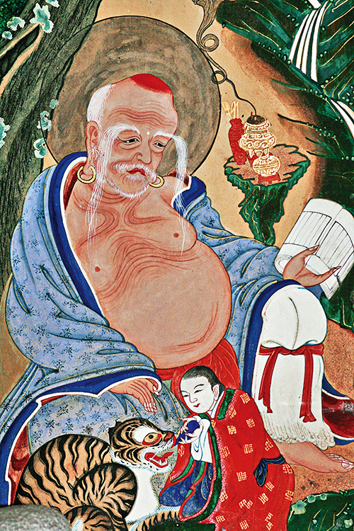 또한 조선말 서울ㆍ경기지역 불화승을 대표한 경선당 응석스님이 1892년에 그린 흥국사 십육나한도 중 제4 소빈타존자도는 <아육왕경> ‘호자인연(虎子因緣)’이야기를 그렸다. 존자는 휘어진 낙락장송에 기댄 채 책을 읽고 있지만 약간 찌푸린 얼굴엔 미심쩍은 표정이 역력하다. 오호라, 아래를 보니 어린 동자가 호리병에든 흰 젖을 새끼 호랑이에게 먹이고 있다. 새끼 호랑이는 기분이 좋은지 금빛 눈으로 연신 붉은 혀를 내밀어 받아먹지만 존자는 “젖병은 잘 삶았는지? 젖은 잘 주는지? 트림은 시켰는지?” 걱정이 이만저만이 아니다. 이처럼 흥국사 십육나한도는 불보살의 근엄한 모습과는 달리 특색 있는 동작과 표정으로 재미를 주고 있다.