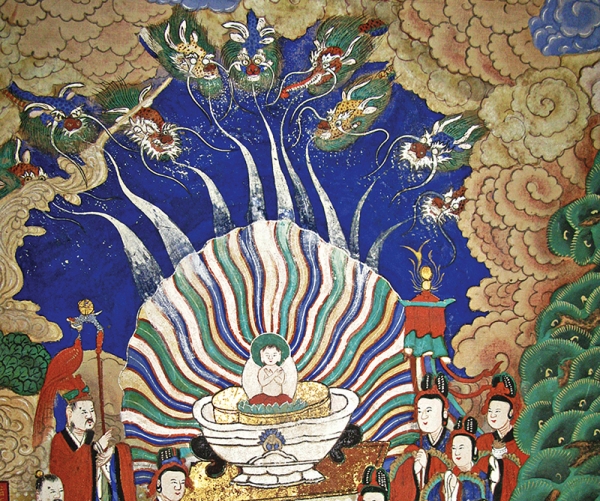 해인사 대적광전의 부처님 탄생 장면은 그야말로 예경과 찬탄의 시간이다. 부처님이 탄생하시니 하늘의 아홉 마리 용들이 향수를 뿜어 태자의 몸을 씻어주었고 사천왕이 하늘의 비단으로 받아 모시어 보배 안궤(安) 위에 놓았다. 또 제석이 일산을 잡았으며 범천이 흰 불자(拂子)를 가지고 좌우에 모시고 섰다. 그 아래는 천녀들이 향수를 그릇에 담아 두었으며, 천녀 좌측에는 두 개의 연못이 홀연히 솟아올랐다.