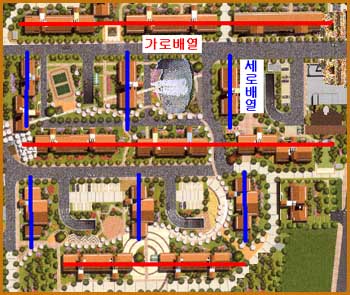 이 경우도 만약 풍수에 따라 가로동을 정생양과 정왕향으로 놓았다면, 세로동도 90각도를 튼 자생향과 자왕향의 길한 좌향을 놓을 수 있어 전혀 문제가 되지 않는다. 따라서 아파트 전체의 기본 좌향을 정향으로 놓는 일이 가장 중요하다.