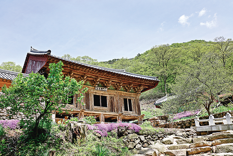 완주 화암사 우화루. 앞쪽에는 누각 형태로 판문을 설치했고, 뒤쪽은 트인 공간으로 극락전의 분합문을 들어 올리면 극락전과 우화루가 하나의 정토 공간이 된다.