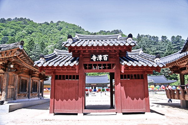 어느 날 스님의 꿈에 설악 산신령이 나타나 ‘대청봉에서 이곳 절까지 물웅덩이 숫자를 절 이름으로 하라’고 일러주어 백담사(百潭寺)라 이름을 고쳤다고 한다. 그 뒤 화재는 사라졌지만 어찌 화재예방 차원 뿐이겠는가? 물웅덩이라는 다양한 중생의 마음에 부처님이란 물을 담아주어 중생의 갈증을 풀어주는 곳이 바로 백담사이다. 수심교(修心橋)를 건너면 금강문, 백담사 편액이 걸린 솟을대문의 삼문, 가늘게 하늘로 치솟은 고려후기 삼층 불탑과 극락보전이 일직선상에 자리하고 있다. 극락보전엔 보물로 지정된 영조24년(1748)에 조성한 목조 아미타불을 모셨는데 단정한 얼굴, 가늘게 뜬 눈, 당당한 어깨, 넓은 무릎, 하품중생인의 손 모습은 자비가 서려 있다.