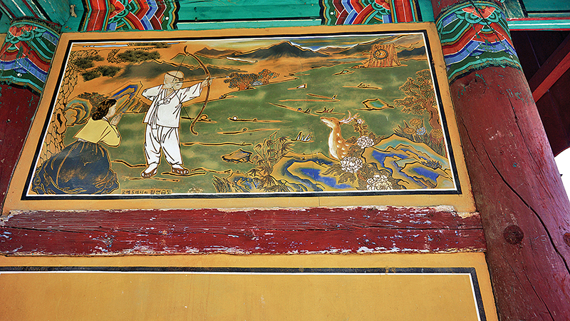 활 쏘는 궁예 모습을 볼 수 있는 벽화. 궁예가 칠장사에서 활쏘기를 하며 유년기를 보냈다는 이야기가 전해온다.