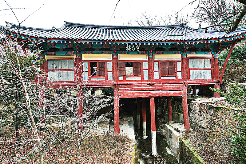 마음을 정화시키는 맑은 계곡, 허공을 나는 누각도 옛사람의 호사스러움이었을까? 가운루는 주변의 도로와 다리, 건물로부터 포위당하고 계곡은 배수구 속에 묻혀 오간 데 없어 갇힌 신선처럼 초라하기 그지없다. 만약 다시 옛 모습을 찾는다면 구름이 다시 누각 위를 날고 신선이 된 최치원이 내려오는 기쁨을 맛볼 수 있지 않을까? 가운루는 계곡 위에 세워져 개울을 건네주는 다리이면서도 누각 형태의 건물이다. 전면 2칸, 측면 5칸 팔작지붕의 누각으로 길이 16.2m에 높이가 최고 13m로 대략 아파트 5층 높이와 맞먹는다. ‘V’형 협곡에 세우다 보니 누각의 기둥은 계곡 중앙으로 들어갈수록 길어져 계곡 바닥의 지형에 따라 들쭉날쭉하다. 기둥은 거대한 파이프 오르간을 계곡에 세워둔 듯 흐르는 물소리에 부딪혀 천상의 소리가 들린다.