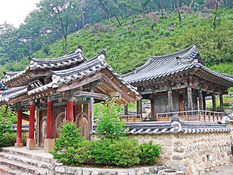 의성 고운사 연수전(延壽殿)과 만세문(萬歲門). T자형의 전각으로 작고 단아하게 지어진 연수전 3면엔 조선 고종황제의 만수무강을 기원하는 글이 적혀 있고, 만세문은 궁궐 대문 형태의 ‘솟을삼문’으로 격식과 권위를 나타냈다.