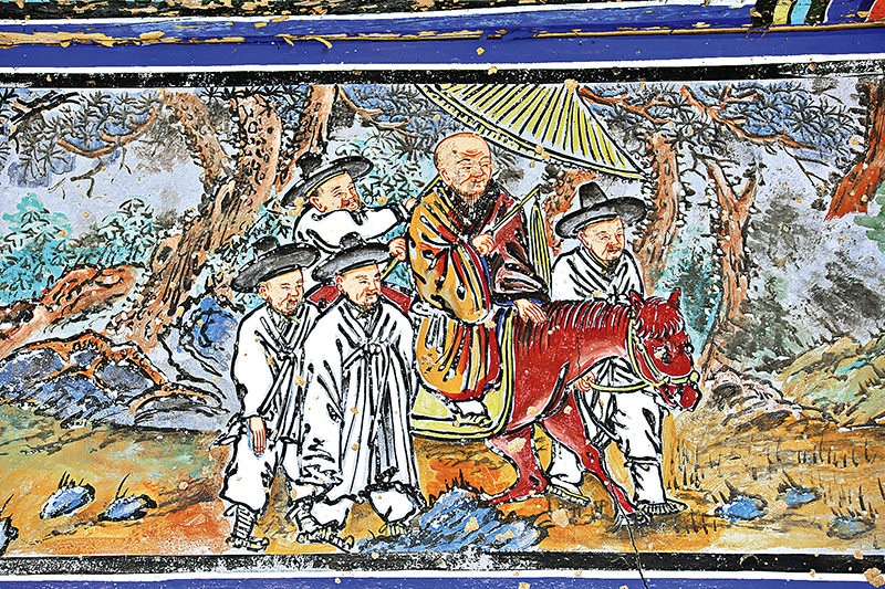 사명각(四溟閣) 외벽의 벽화 ‘사명대사 일본가는 길’. 불교를 업신여기던 조선의 사대부가 말고삐를 잡고 일산을 받쳐 들고 대사를 따르는 모습이 눈길을 끈다.