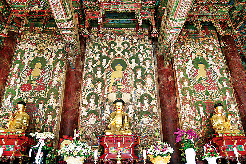 조선후기 삼세불화를 대표할 빼어난 작품으로 꼽히는 대웅전 삼세불화.
