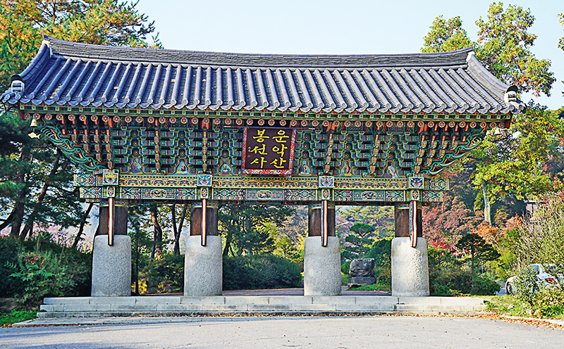봉선사 일주문을 바라보면 ‘어! 한글이네’ 하는 반가운 마음으로 앞의 ‘운악산 봉선사’ 한글 편액과 뒤에 ‘교종본찰 봉선사’란 한자 편액을 볼 수 있다. 일주문만 보아도 봉선사는 불경의 한글 역경사업의 중심도량임을 알 수 있다. 봉선사는 조선 명종6년(1551) 허응당 보우스님의 목숨을 건 선교양종의 승과 부활로 교종의 으뜸사찰이 되었다. 일주문은 삼문(三門)으로 4개의 돌기둥을 일렬로 세운 것은 흔들림 없는 수행으로 삼독심을 버려서 깨달음에 이르게 하는 삼해탈문(三解脫門)을 표현했다. 대웅전에 걸린 특이한 한글 편액 ‘큰법당’에서는 불경의 한글화에 크게 이바지한 운허·월운스님의 한글 사랑이 느껴진다. 내부에는 한글 <화엄경>과 한문 <법화경>을 동판에 새겨 벽을 이루었다. 6·25전쟁으로 타버린 법당은 철근 콘크리트를 구조이지만 전각의 전통성을 잘 표현하여 그 가치를 인정받고 있다.
