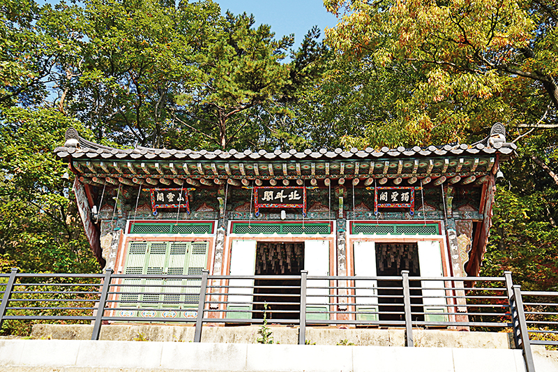 산신, 칠성, 독성 세 가족을 한 지붕아래 모신 봉선사 삼성각. 산령각, 북두각, 독성각 세 편액이 함께 걸려있다.