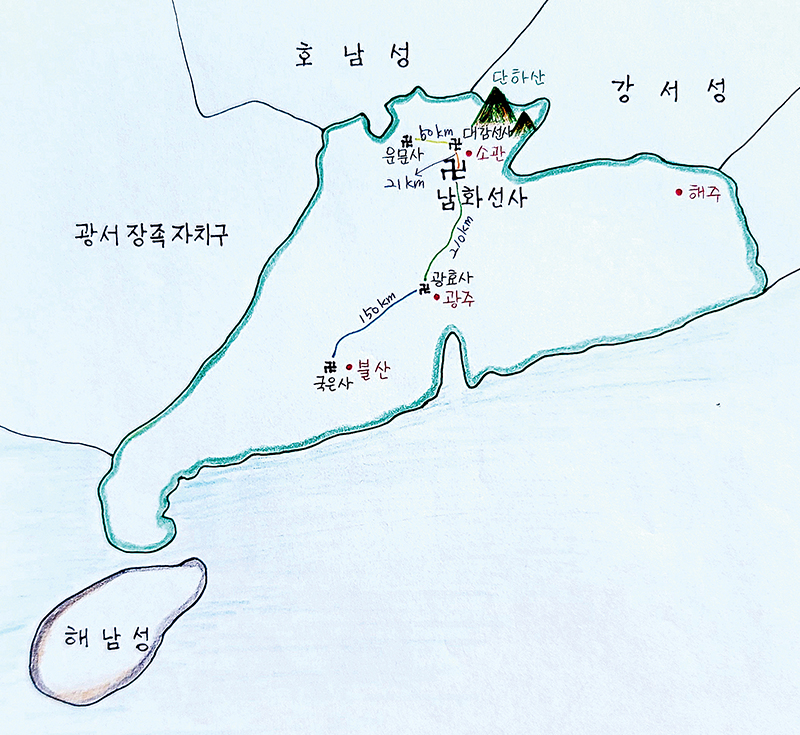 남화선사(南華禪寺)는 선종 육조(六祖) 혜능(慧能)선사의 행화로 유명한 사찰이다. 중국 불교사에 있어 빼놓을 수 없는 사찰로 현재도 선종의 중심도량이다. 예로부터 “영남의 선림 가운데 으뜸”이라고 칭한다. 사찰은 광동성(廣東省) 소관시 곡강현 동남쪽 약 6km 떨어진 조계산(曹溪山) 북쪽 언덕에 위치해 있다. 남조 양무제 천감 원년(502)에 창건되었다. 1500년의 긴 역사와 전통을 지닌 경치가 아름다운 고찰이다. ‘조계’라는 지명의 연원은 아주 먼 옛날에 조조의 현손(玄孫)인 조숙량이 이곳과 멀지 않은 곳에 거주하였기에 마을 이름을 ‘조후촌’이라 칭하여 ‘조계(曺溪)’라고 했다는 기록이 있다. 그러나 한편으로 ‘조계’는 본래 시냇물을 가리키기도 하는데, 혜능선사의 등장으로 선종의 대명사로서 세상에 널리 알려지게 되었다.