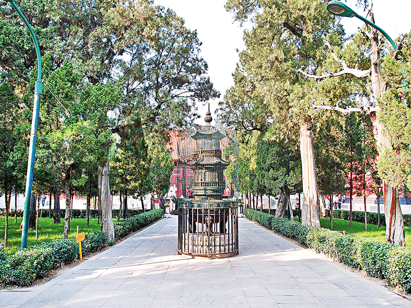 건축물 배치는 전통 중국사원과 마찬가지로 남향이며 중앙에서 차례로 내려가며 양쪽에 대칭을 이루고 있다. 중앙에는 산문전, 보광명전, 관음전, 선당, 만불루가 배열되어 있고, 겹겹이 있는 누각 사이의 굽어진 회랑에 20여 그루의 오래된 측백나무가 번갈아 서 있다.